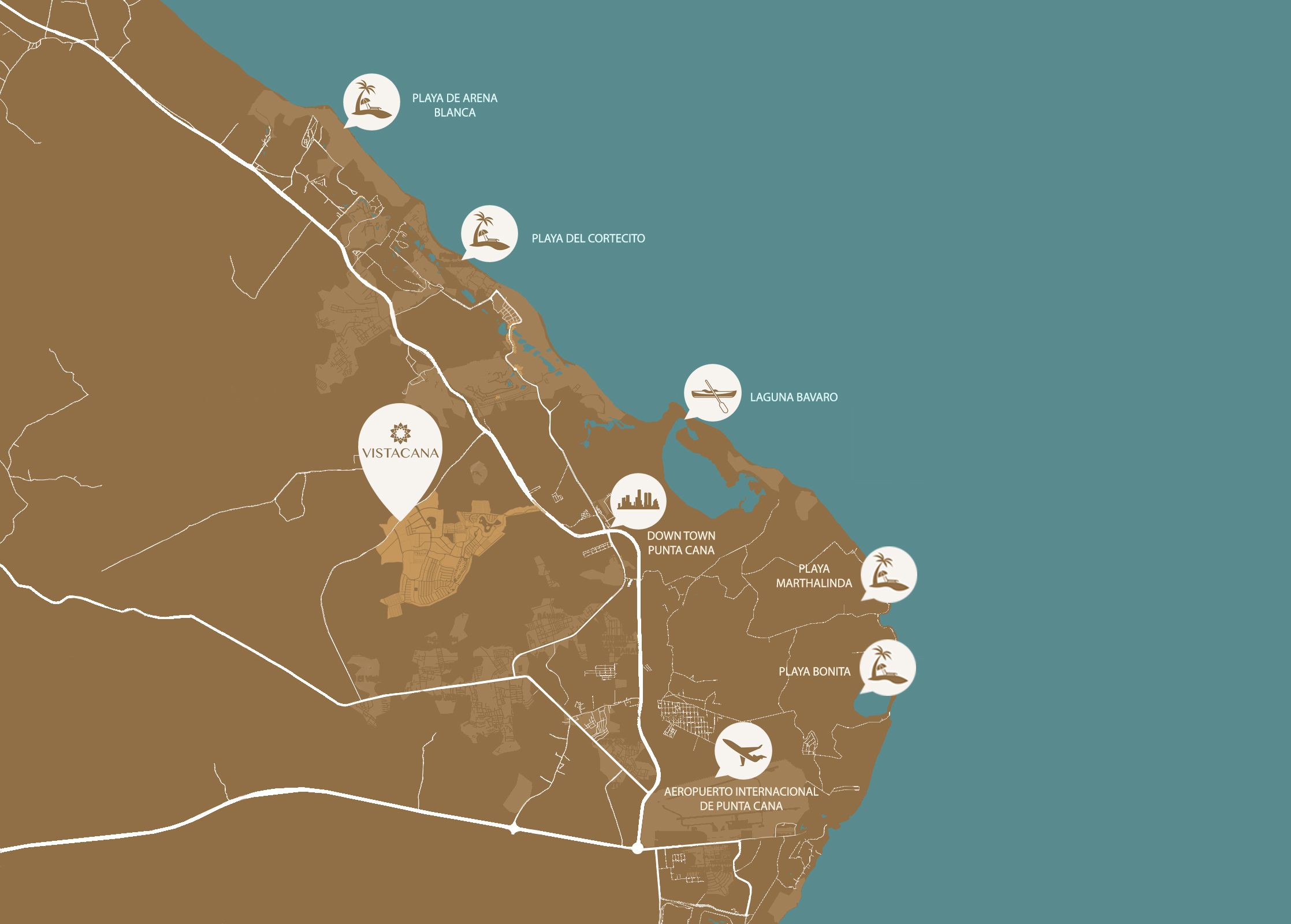 ¡Así es VISTACANA! ¡Es un gran complejo urbanístico localizado a 10 minutos del Aeropuerto Internacional de Punta Cana en República Dominicana y a 5 minutos de las más bellas playas de aguas turquesas del Caribe!